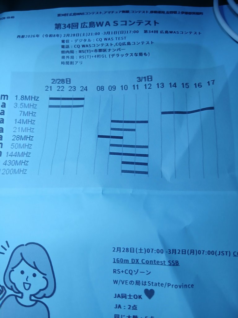 電話 : CQ WASコンテスト,CQ広島コンテスト 県内局 : RS(T)+市郡区ナンバー 県外局 : RS(T)+4桁GL (デラックスな局も) 時間割アリ |